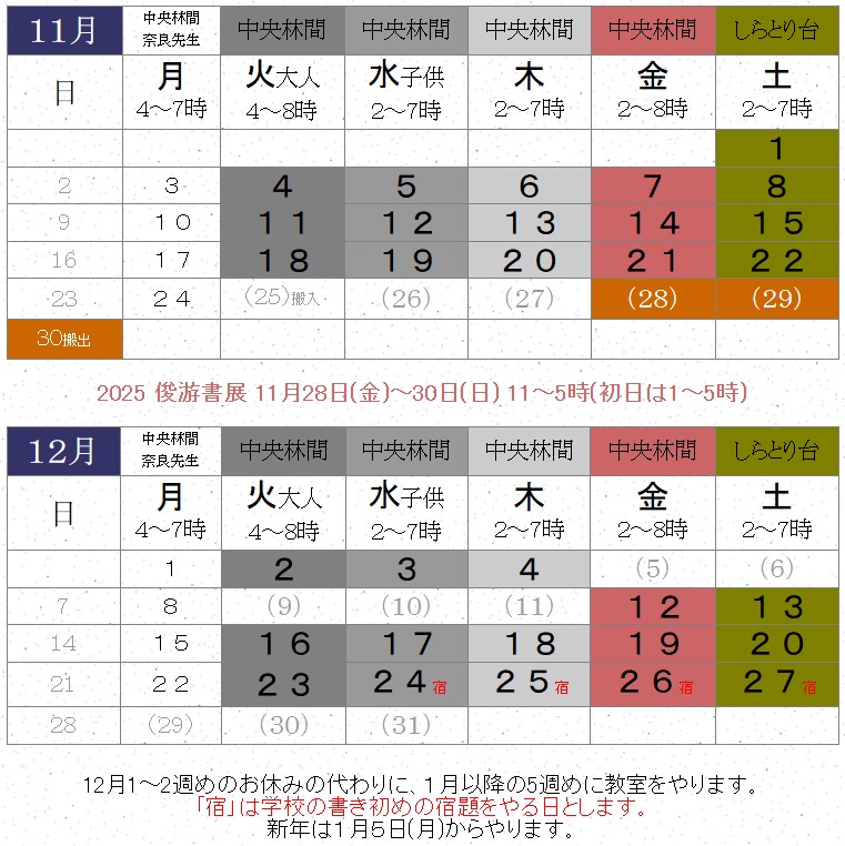 今週11月25日(火)〜29日(土)は俊游書展のため、教室はお休みです。どうぞ